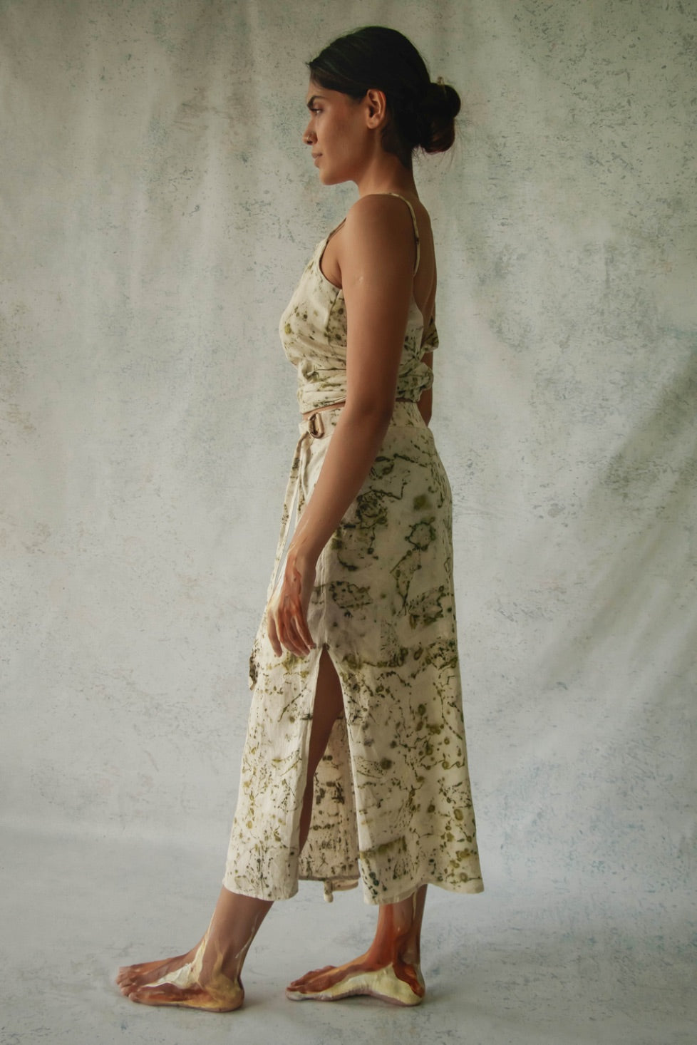 The garment is printed with Almond leaves, using one of the most water-efficient natural dyeing methods. The Gorgeous prints of leaves are truly unique and make you feel hugged by nature.