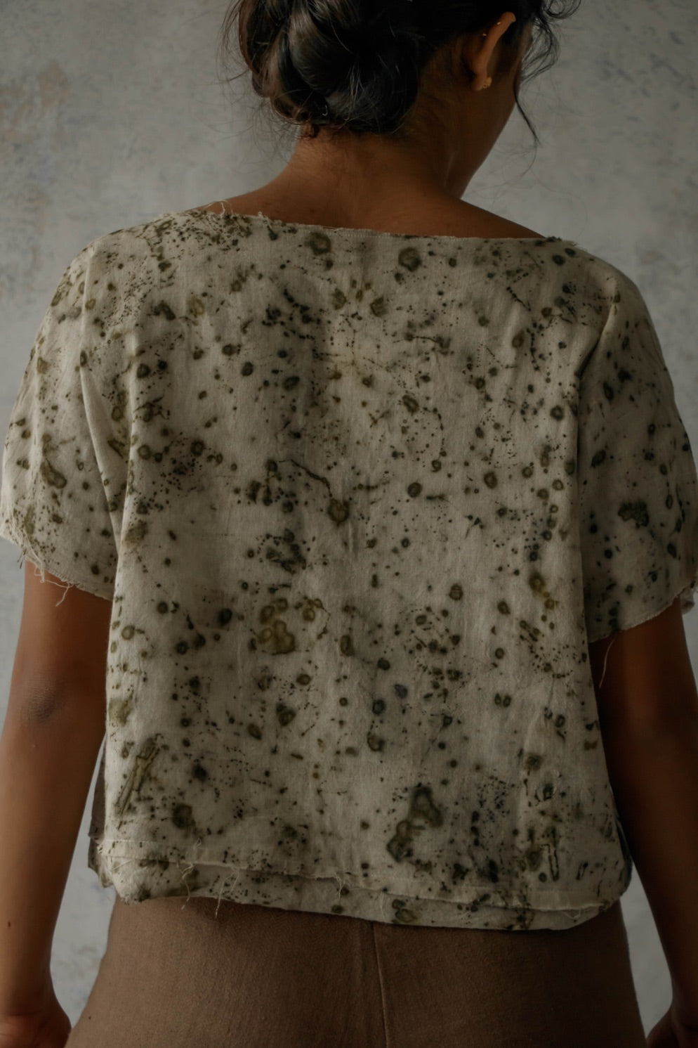 The garment is printed with Almond leaves, using one of the most water-efficient natural dyeing methods. The Gorgeous prints of leaves are truly unique and make you feel hugged by nature.