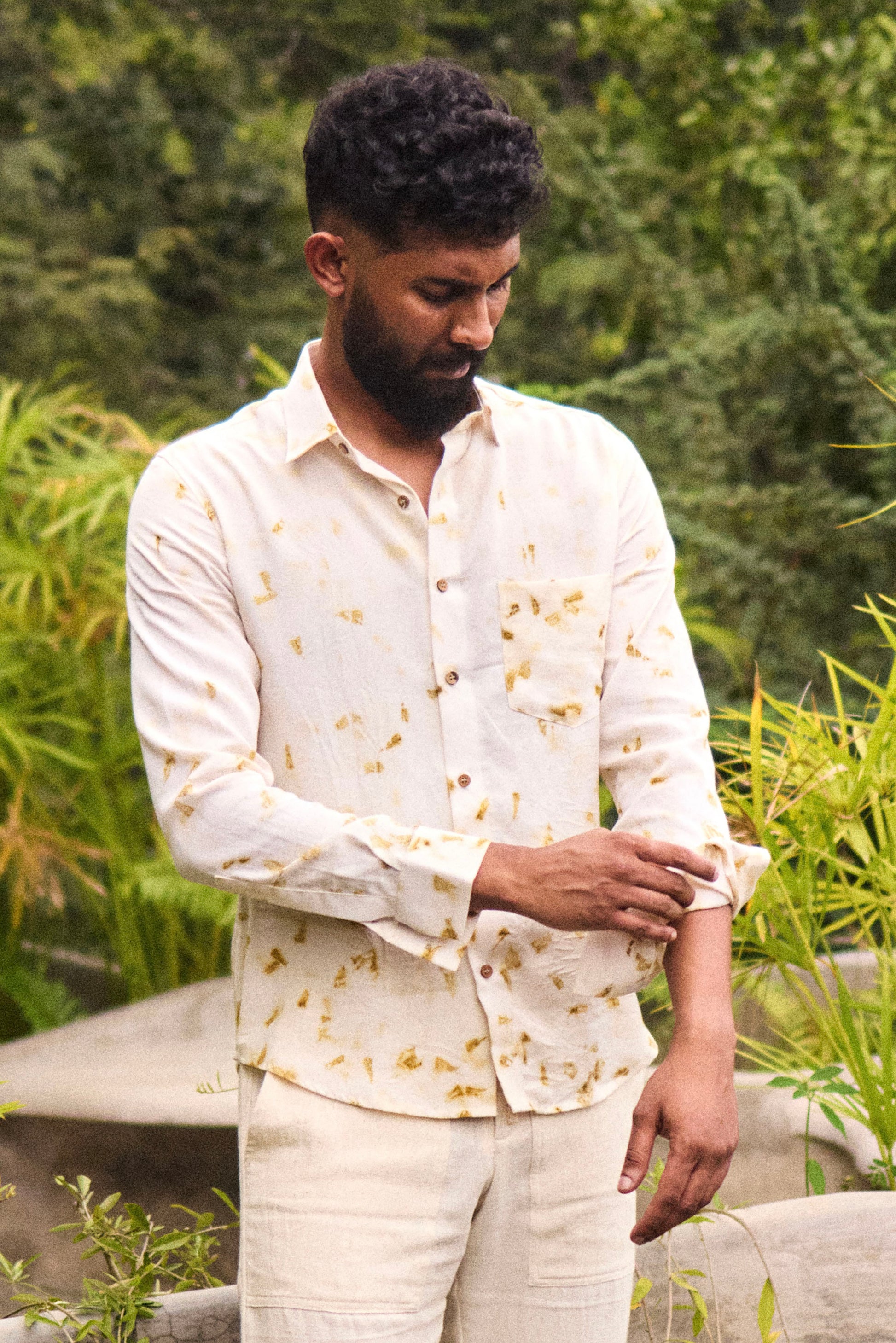 The garment is printed using marigold flowers that are grown in our dye garden or that are sourced from our local temples. A print so vivid and real that it seems as if the flowers will live on through it.