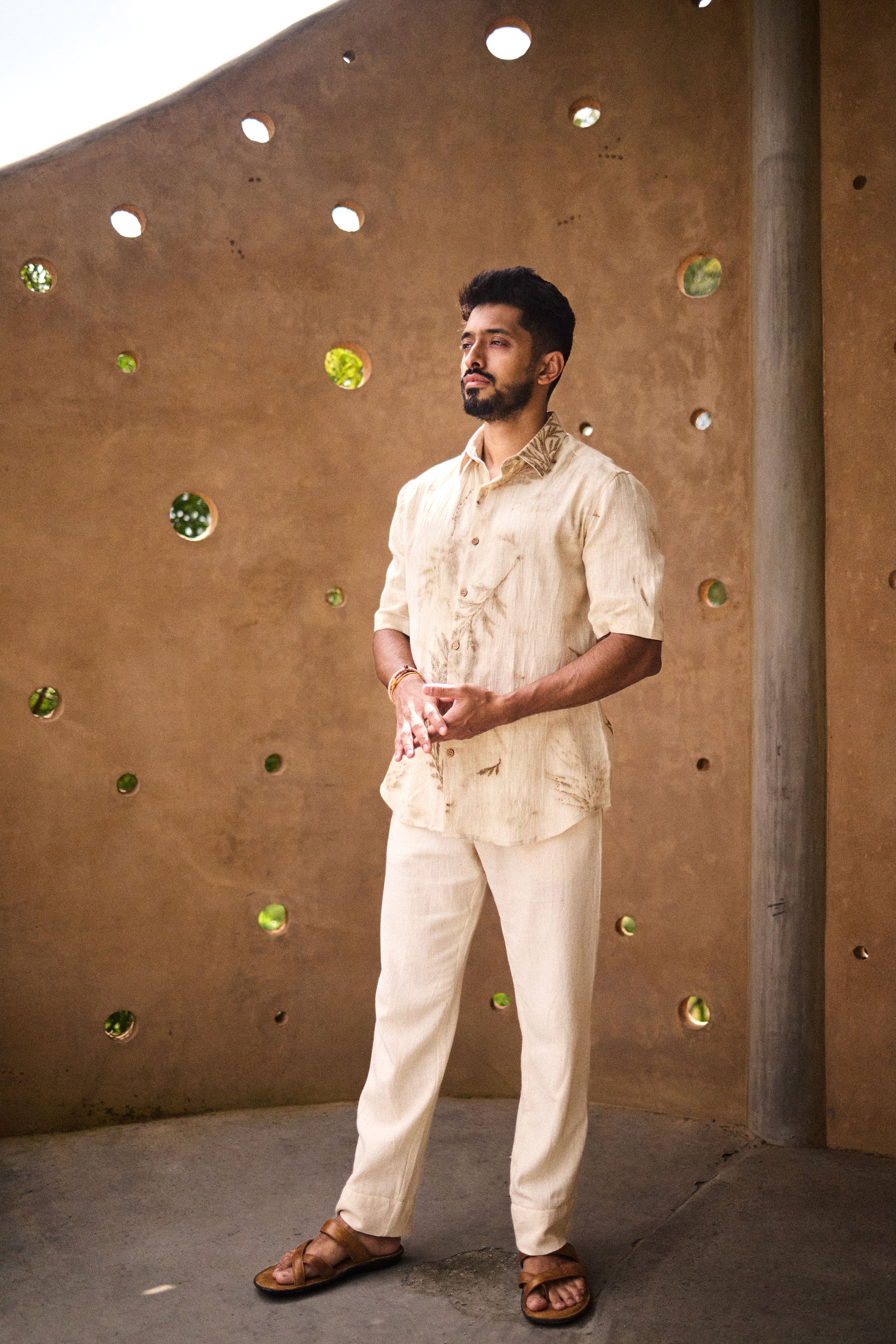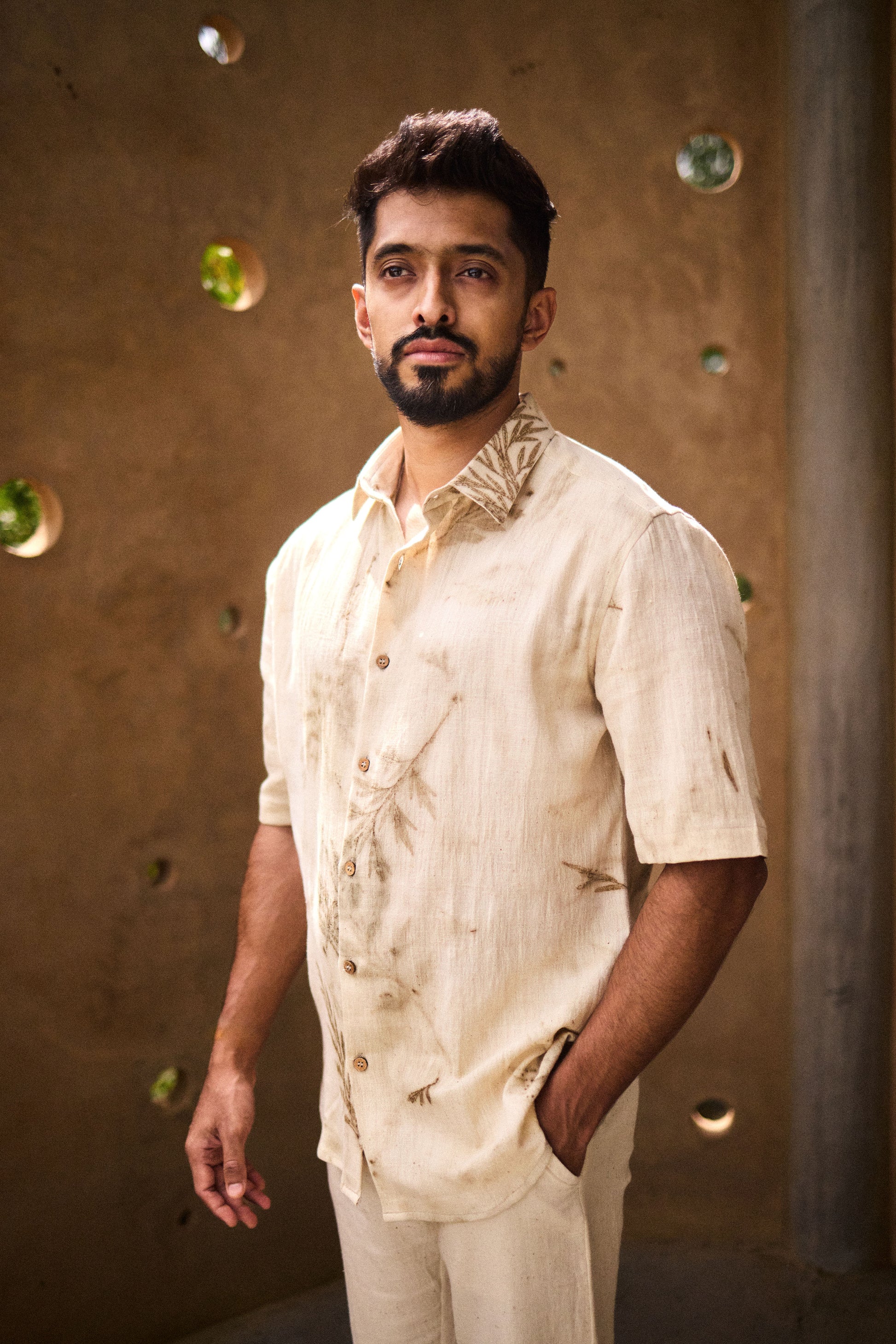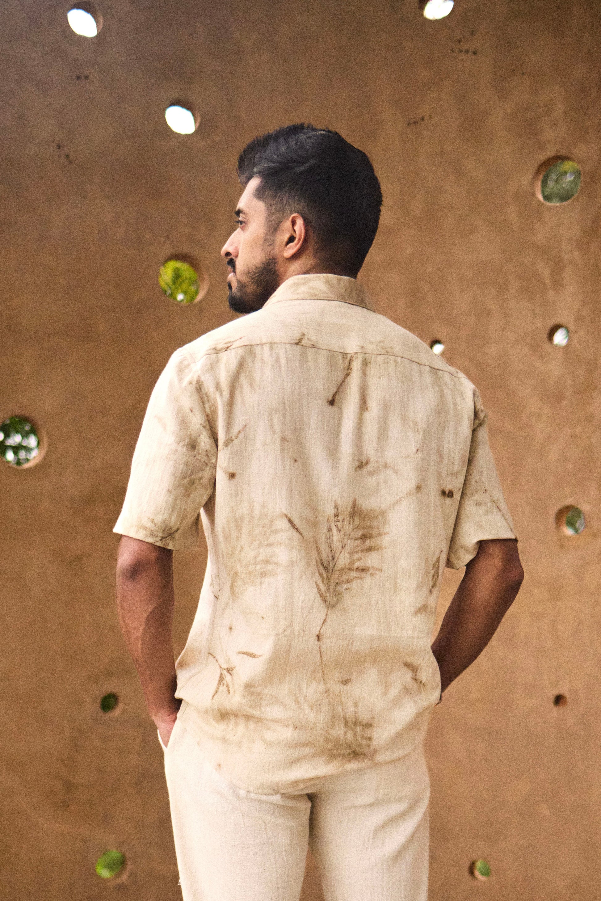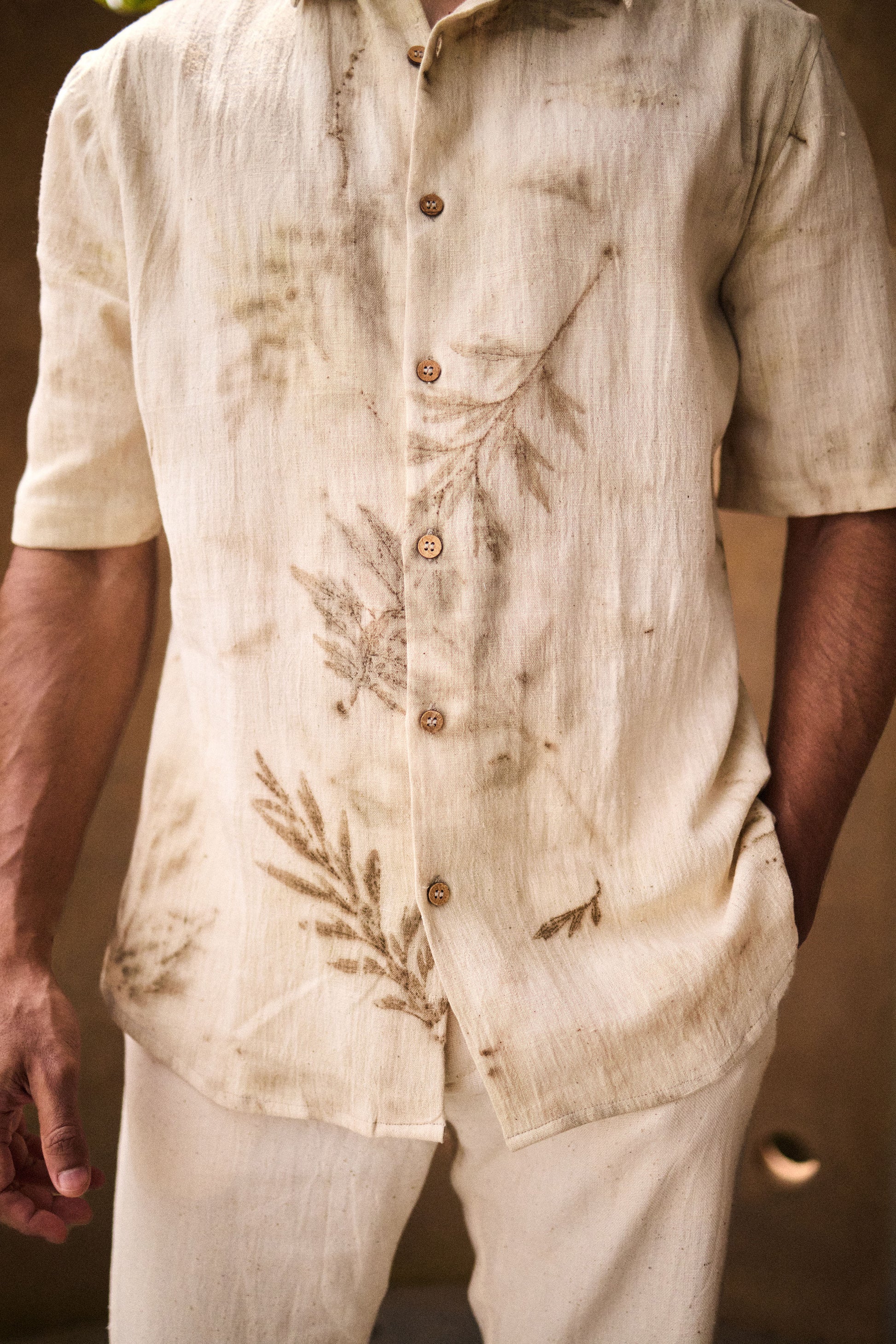 The garment is printed with Silver oak leaves, using one of the most water-efficient natural dyeing methods. The leaves leave the most intricate impressions that are unbelievably crisp.