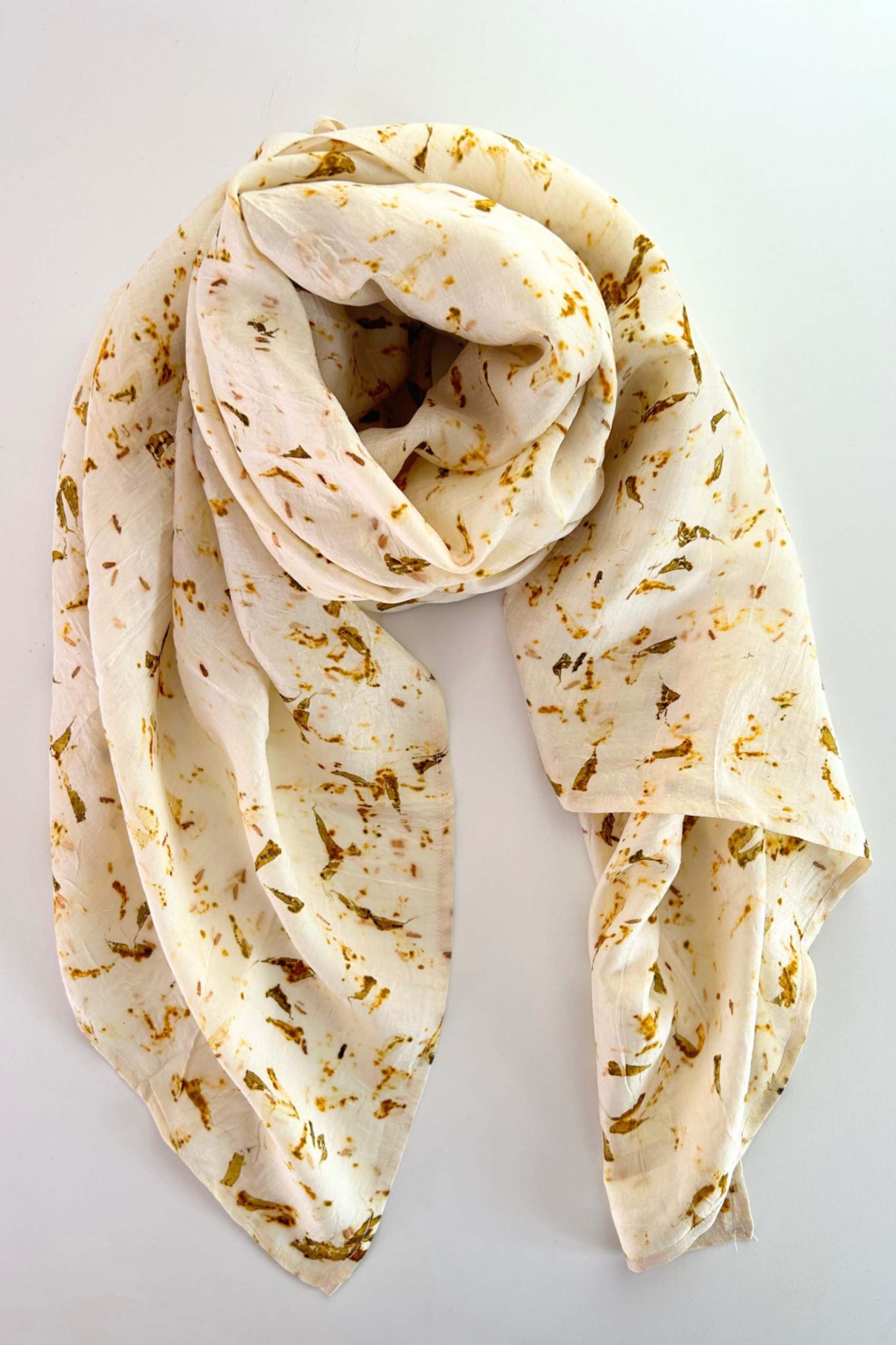 Made from Mulberry silk so fine and light that you’ll forget you’re wearing it. The garment is printed with Marigold and Cumin, using one of the most water-efficient natural dyeing methods. The golden yellows of marigold petals and burnt umber of cumin seeds come together beautifully and create this vivacious print.
