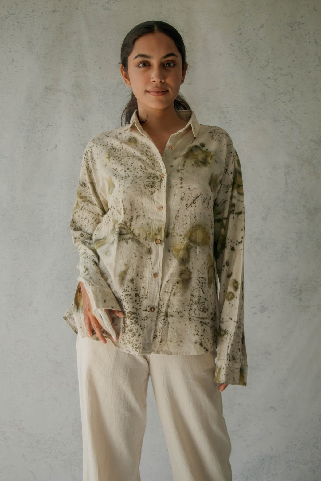 The garment is printed with Almond leaves, using one of the most water-efficient natural dyeing methods. The Gorgeous prints of leaves are truly unique and make you feel hugged by nature.