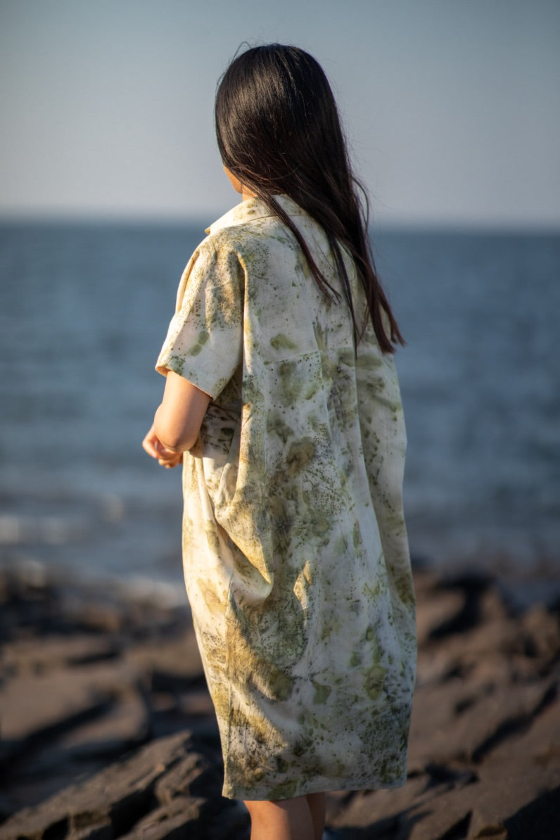 Made from a fabric that ages beautifully and gets softer with every wash. The garment is printed with Almond leaves, using one of the most water-efficient natural dyeing methods. The Gorgeous prints of leaves are truly unique and make you feel hugged by nature.